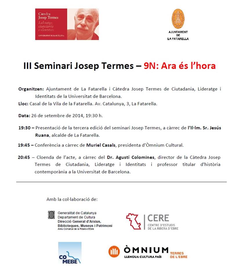 El divendres 26 de setembre, a les 19:30h., se celebrarà el III Seminari Josep Termes. Amb el títol de “9N: Ara és l’hora“, la Dra. Muriel Casals , presidenta d’Òmnium Cultural i professora de la Universitat Autònoma de Barcelona, pronunciarà la conferència principal, acompanyada per l’Il·lm Sr. Jesús Ruana, alcalde de La Fatarella, i Agustí Colomines, director de la Càtedra UB Josep Termes i IP del GRENPoC. L’acte tindrà lloc a La Fatarella, al Casal, a l’Avinguda Catalunya, 3.